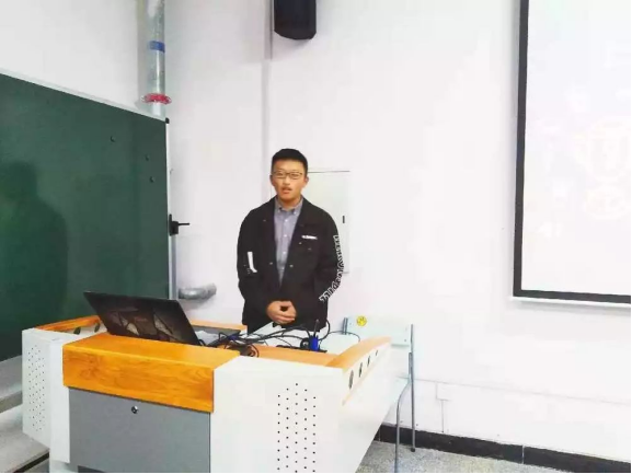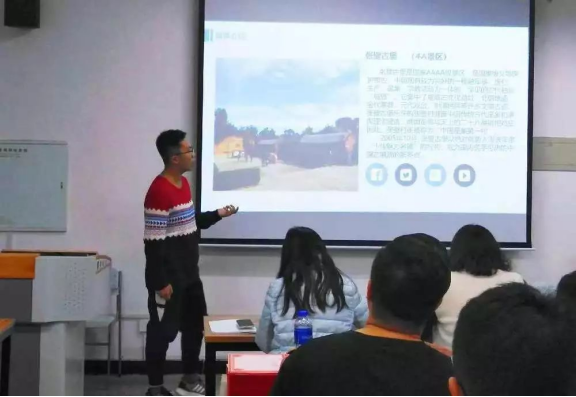 首位同学是17级游戏设计与制作1班的马云飞,他暑期实践的地点是上党红色文化基地。为了提醒人们不忘初心,牢记使命 ,对上党红色文化展开了一系列整理研究,并进行了由文化遗产转化为产业链的跨越行创业实践。并向在场人员展示了美丽的上党主战场——老爷山 。演讲可谓别开生面,迎来了老师和同学们的阵阵掌声与喝彩。